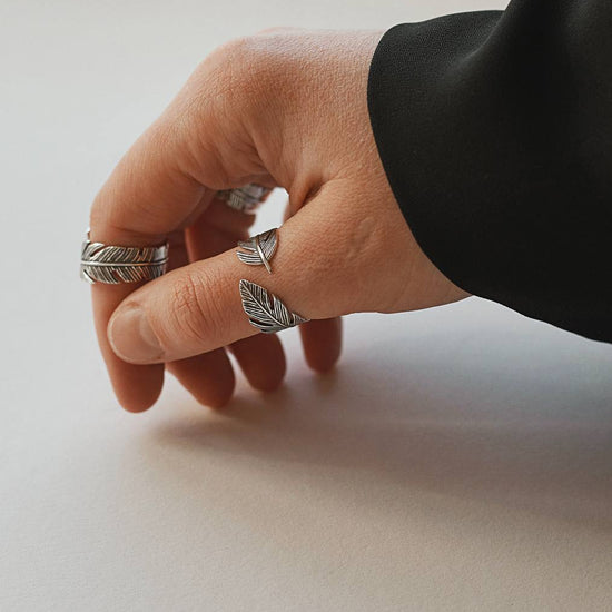 Колечко-пір'я зі срібла 925ʼ проби з родієм, є витонченим виразом свободи та легкості. Елегантні пір'їнки додають цьому аксесуару виразності та характеру. Цей аксесуар ідеально підійде тим, хто шукає щось незвичайне та символічне для свого щоденного стилю або як унікальний акцент для вечірнього образу.